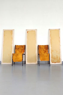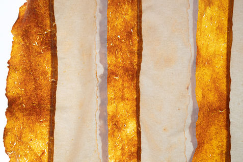 Orangenleder angefertigt aus den Resten schon ausgepresster Orangenschalen. Püriert und mit Biopolymeren vermengt wird es auf die mit Alttextil bespannten Trockenrahmen aufgetragen und mithilfe der Restwärme von Bäckereiöfen zu einer Art Leder getrocknet. Dieses kann daraufhin vom Textil abgezogen werden. Aus dem Holz der Rahmen und dem Textil werden gemeinsam mit dem Orangenleder zwei Markisen. Schaufenster durch Buttermilch intransparent gestrichen. Serviert wurde zur Eröffnung kalte Orangenbuttermilch.